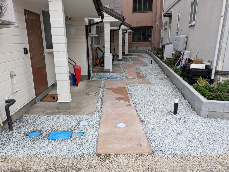 ホーム外構工事部門 アパートコンクリート工事 2025年7月1日2025年7月3日 SHARE ポスト シェア はてブ LINE 玄関に続くコンクリートにアパート名をつけました。 文字部分は事前に型を作成し、コンクリート打設時に正確な位置とバランスで埋め込んでいきます。仕上がり後も文字がくっきりと浮かび上がるよう、素材や仕上げ方法にも工夫を加えました。